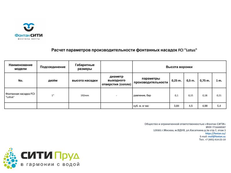 Фонтанная насадка FCI "Lotus" наилучшим образом подходит для малых фонтанов с высоким уровнем водной подготовки. Данные ограничения обусловлены тем, что насадка имеет достаточно небольшие выходные отверстия, которые в свою очередь подвержены засорению некачественной водой.