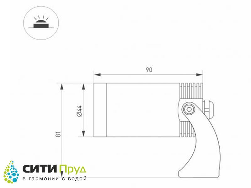 Подводный светодиодный светильник производства Arlight. Цвета свечения: RGB + холодный белый 6000К; теплый белый 3000 К. Размеры DxH ?44х90мм. Максимальная глубина установки под водой 2 м.