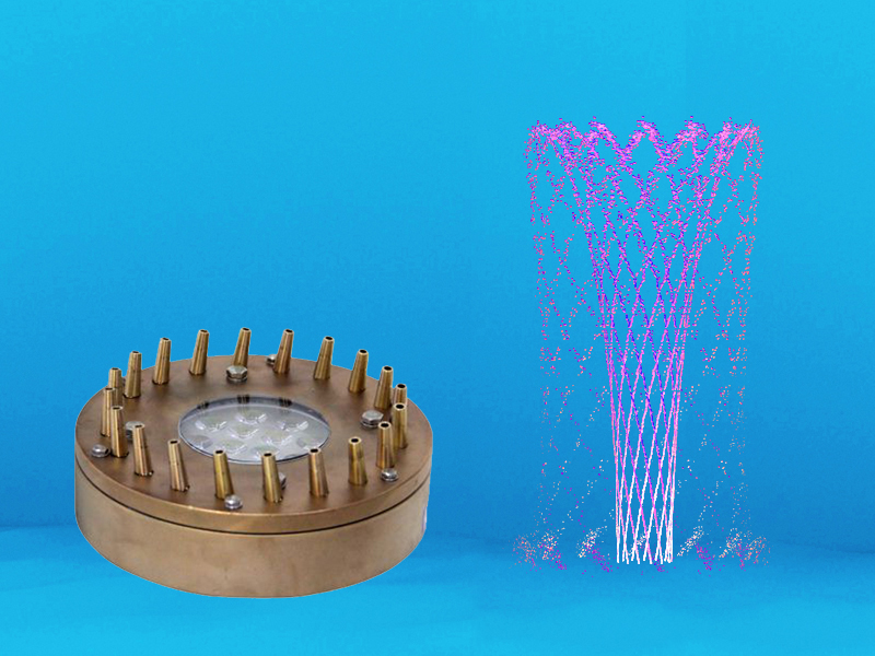 Насадка предназначена для формирования объемных водных композиций в уличных фонтанах. Материал насадки : бронза. Большое количество объединенных в единую композицию фонтанных струй формирующих вертикально направленную спиралевидную форму в виде вазы, прекрасно дополнят содержанием любой городской или парковый фонтан. Спираль формируется из за небольшого наклона струй размещенных на распределителе потока. Особенностью данной насадки является встроенная в основание RGB подсветка, обеспечивающая насыщенное многоцветное освещение в ночное время суток.