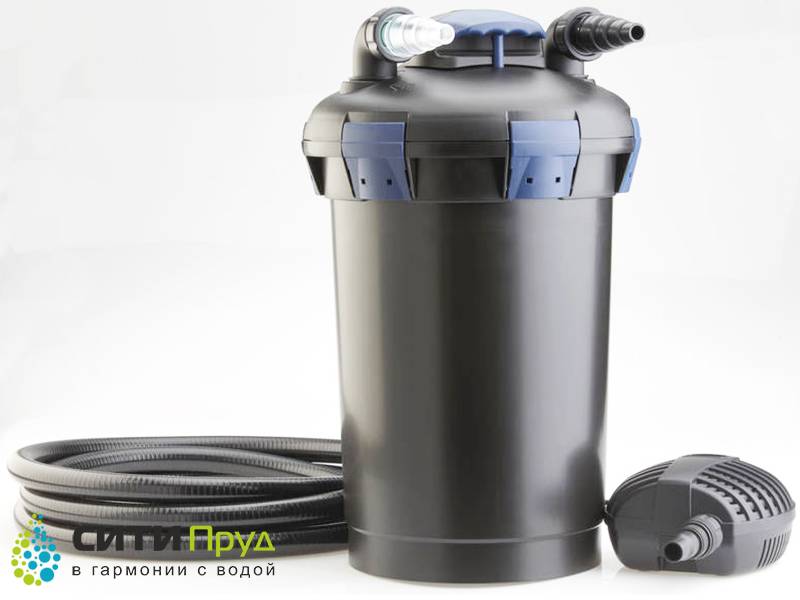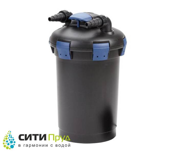 В отличие от проточных фильтров, напорные фильтры поддерживают давление, создаваемое насосом и перекачивают воду дальше под давлением. В такой замкнутой системе они используются преимущественно для подачи воды в ручьи и архитектурные резервуары, на высоту до 1.5 м. Здесь их можно вкопать в землю для сохранения естественного ландшафта в саду. Дополнительным преимуществом напорных фильтров является удобство в обслуживании и чистке, без необходимости его открывать. Т ехнические мощности фильтра дополнены УФ очистителем, который находится под крышкой фильтра.