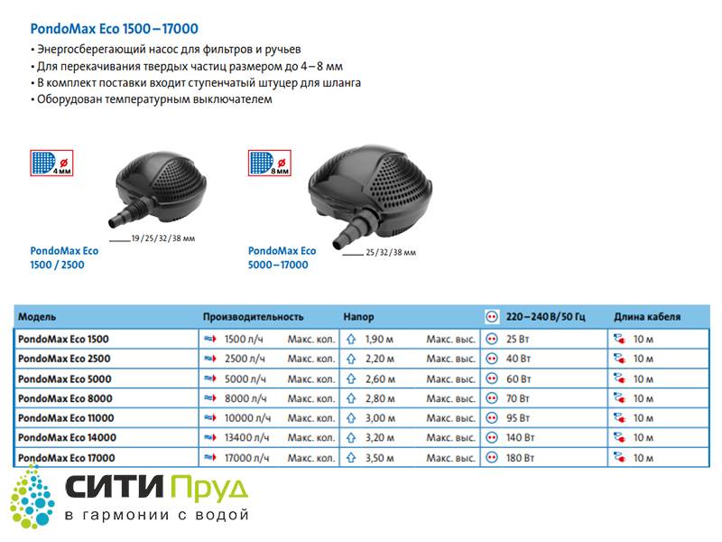 Насосы Pontec PondoMax рекомендуется использовать для систем фильтрации, ручьев и водопадов, так же подходят для скиммеров. Имеют компактный дизайн и способны перекачивать твердые частицы грязи размером до 4 мм PondoMax 1500-2500, а начиная с PondoMax 5000-17000 частицы грязи до 8 мм, длина кабеля 10 м. Разная производительность позволяет обеспечить потребности любого покупателя.
