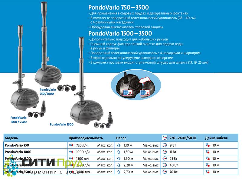 Фонтанный насос с четырьмя насадками в комплекте для использования в садовых прудах, декоративных фонтанах и небольших ручьях. Возможности использования данной серии расширены за счет штуцер , который входит в комплект . Он позволяет использовать шланг или всю или часть воды направить на насадку , а часть воды направить на горку или плюющуюся фигурку. Внимание: штуцер входит в комплект, начиная с Pondo Vario 1500.