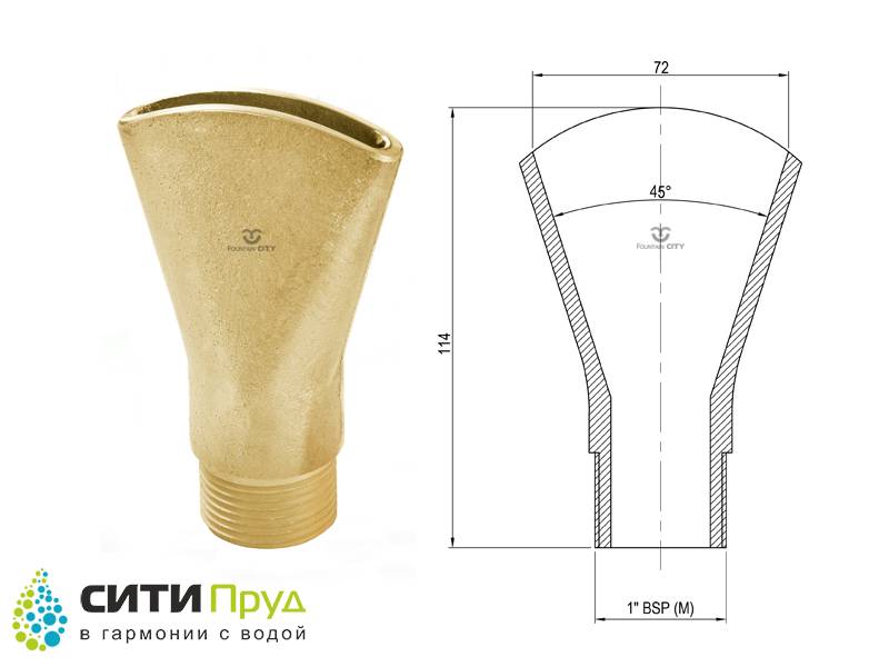 Насадка предназначена для формирования сплошных водных композиций в форме раскрытого веера.