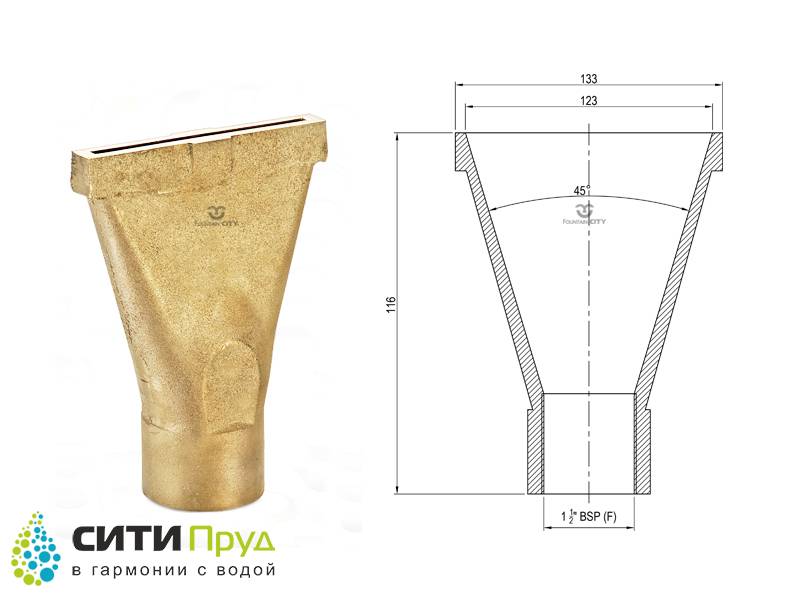 Фонтанная насадка FCI "Water flow" наилучшим образом подходит для уличных фонтанов с классической формой чаши. Насадка имеет выходное отверстие шириной 72 и 123 мм и угол распространения водного потока 45 градусов.