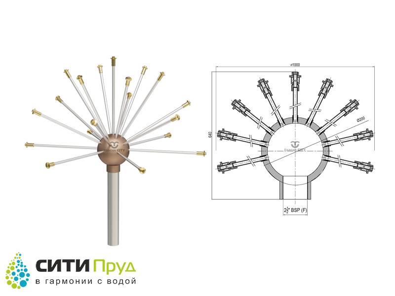 Насадка предназначена для формирования многоструйных водных композиций по форме напоминающих верхушку одуванчика. На конце каждого луча насадки имеется водный распылитель формирующий так называемый "зонтик".