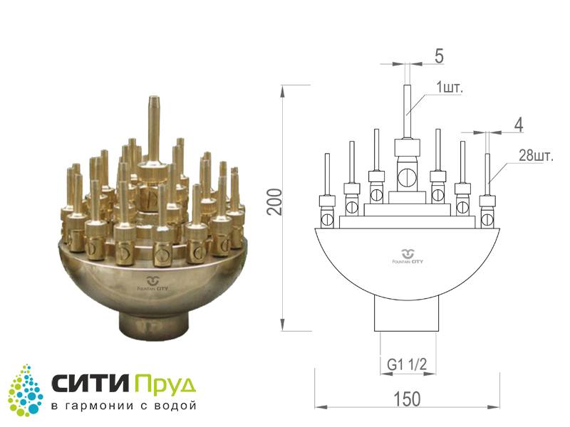 • Направленные наружу струи фонтанной насадки имеют большой радиус разлета и формируют большое количество брызг в зоне падения, что определяет ее применение именно в фонтанах с большими габаритами.